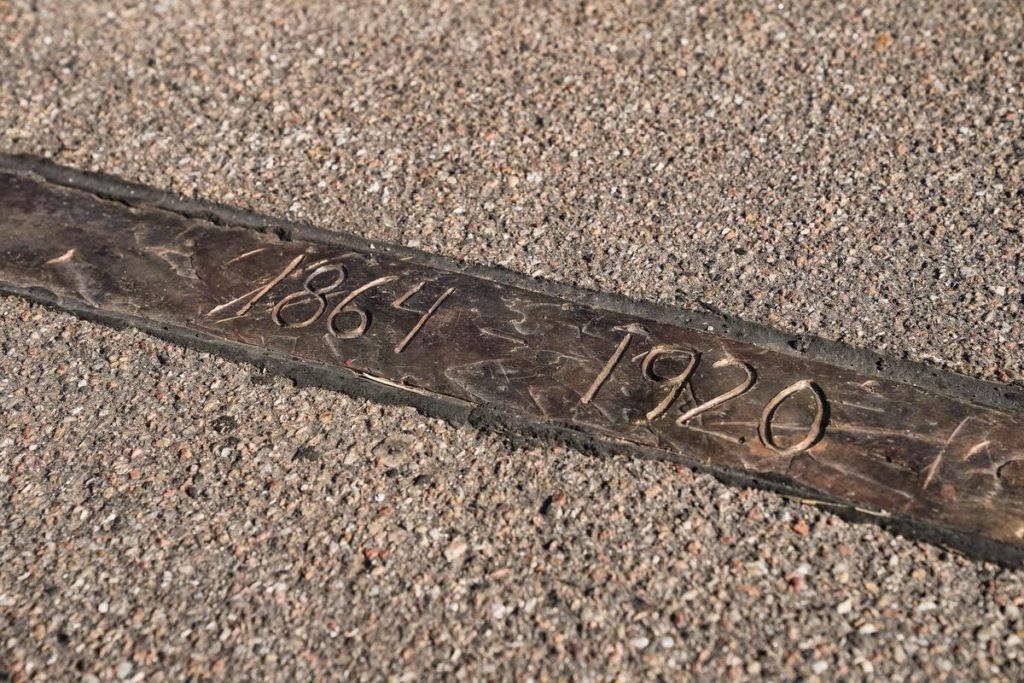 – Båndet har sat sig lidt, siden det blev lagt ned i asfalten for et år siden, og det vil på sigt ødelægge mindestriben. Derfor laver vi nu en stabilisering ved at sprøjte noget lim ind under bronzen, så det igen kommer til at ligge helt fast. Afhængig af luftfugtigheden kan det tage op til 48 timer for limen at hærde”, fortæller konsulent Troels Kragh, fra Kolding Kommune.
