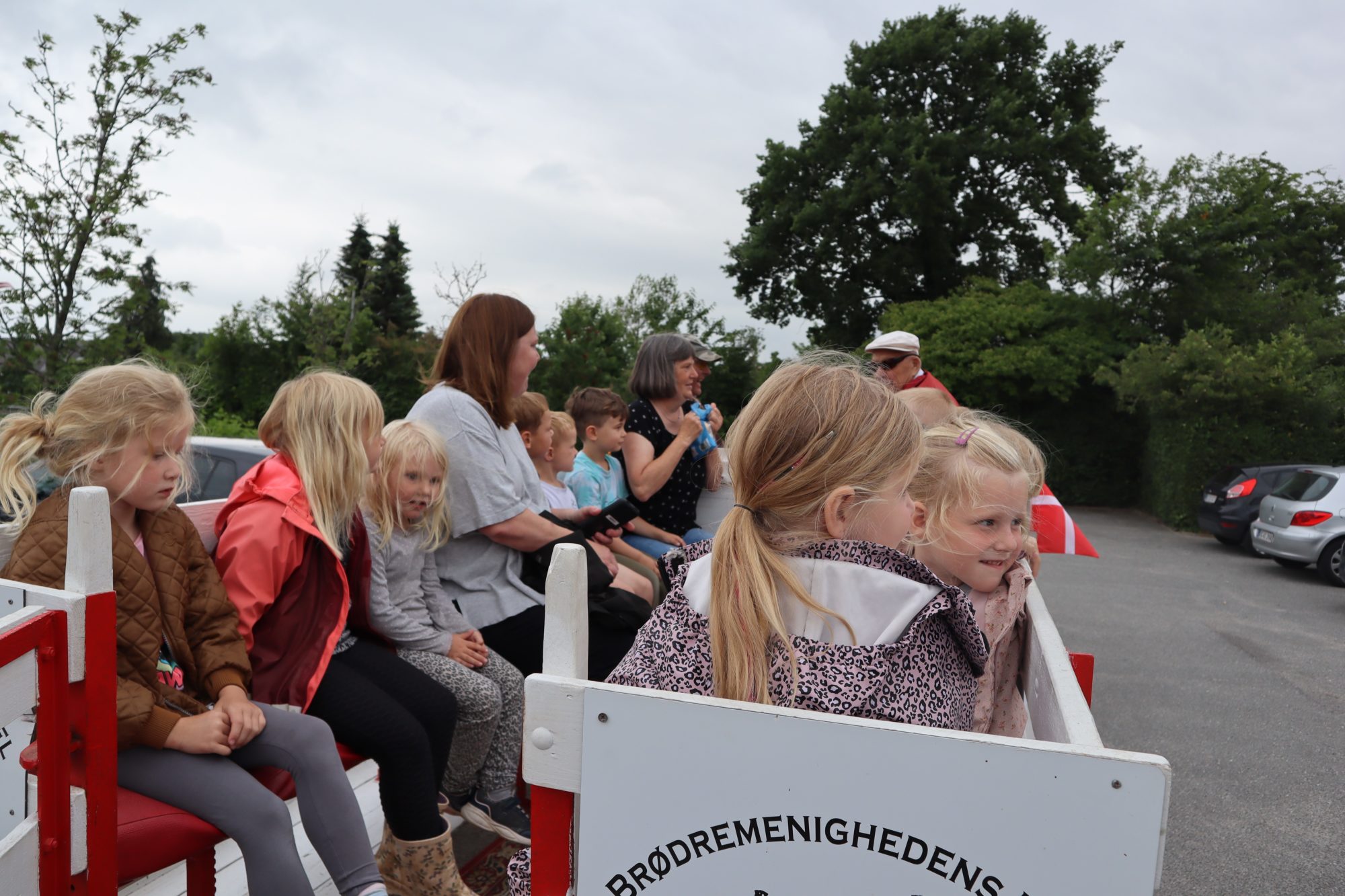 Der var en hestevogn på vej med Andreas Brøchner bag tøjlerne. Omkring 40 børn var mødt op og havde mulighed for en tur rundt i byen sammen med deres pædagog Birthe Rasmussen, der kunne fejre sit 42 års jubilæum i børnehaven.