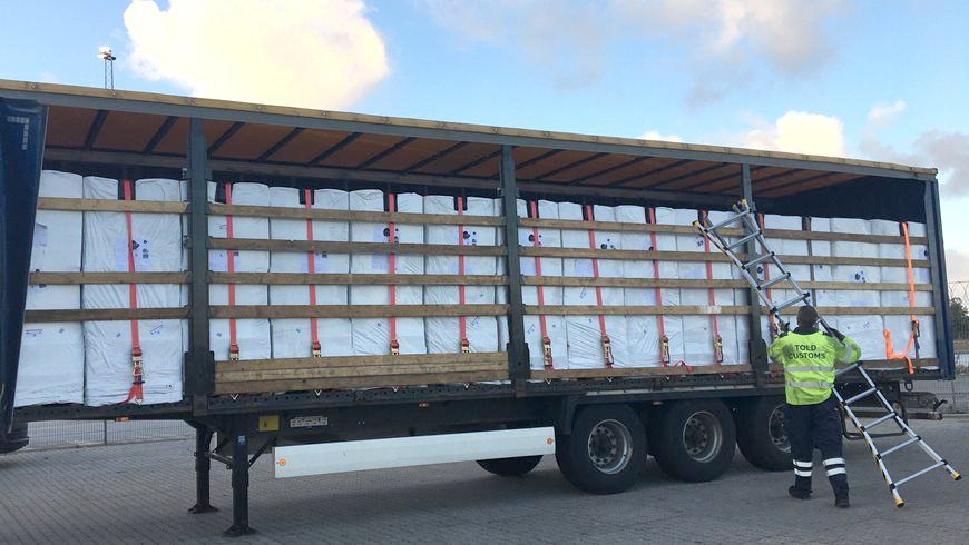 I 2021 registrerede Toldstyrelsen i alt 724 sager på tobaksområdet, der også tæller ulovlig indførsel af vandpibetobak, cerutter, cigarer mm. Som resultat af den styrkede kontrol er der i 2020 og 2021 flere sager, hvor Toldstyrelsen har afsløret forsøg på indsmugling af meget store mængder af ulovlige cigaretter. I 2020 fandt toldere 14 millioner cigaretter i en sættevogn på Esbjerg Havn og 1,6 millioner cigaretter i en række kabeltromler på Aarhus Havn. (Foto: Toldstyrelsen.)