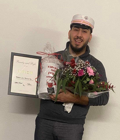 Han blev færdiguddannet frisør hos Beauty and Style i Kolding i 2021.