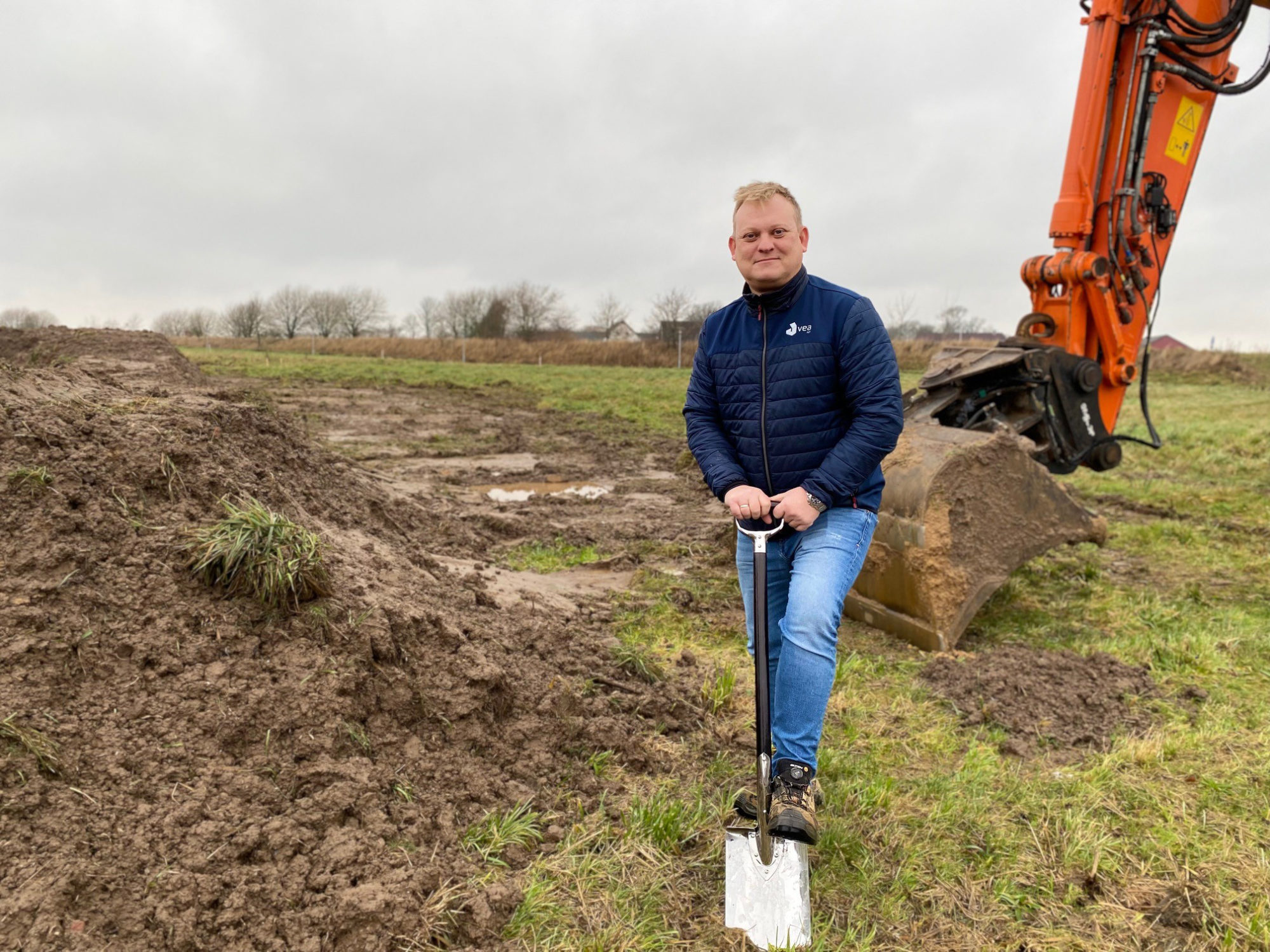 Her tager Jens Hagen fra VEA det første spadestik til det boligbyggeri på Sønderkobbel. (Privatfoto)