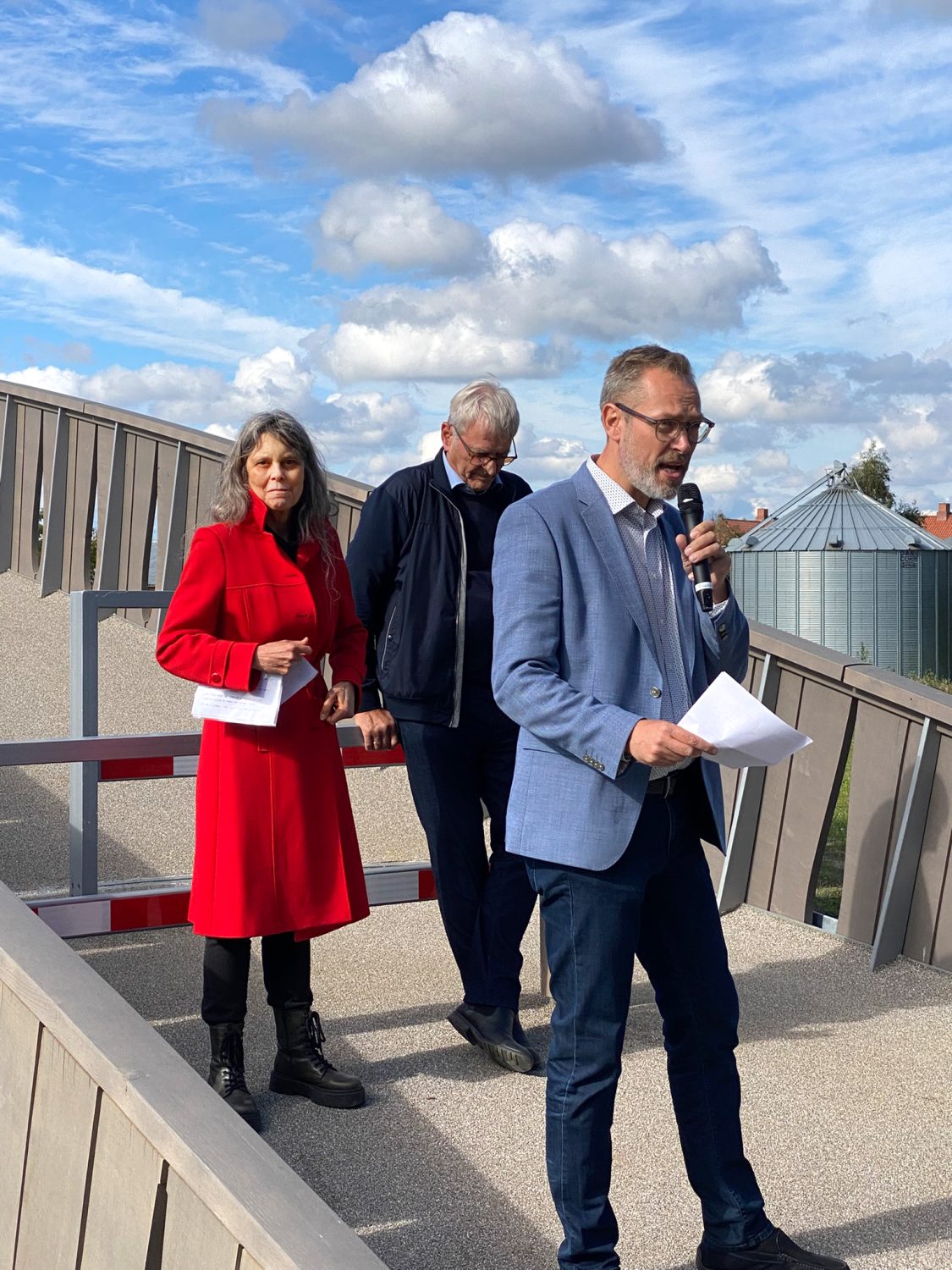 Jakob Ville indviede Dråbebroen den 29. september. Bagved ses kunstneren Sophia Kalkau, som har tegnet broen.