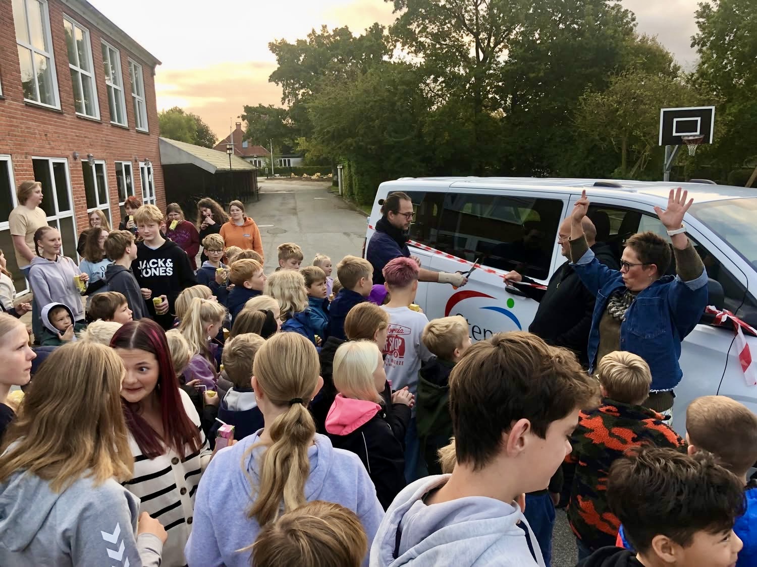 Torsdag morgen før efterårsferien blev bussen indviet sammen med alle elever og personalet. Alle fik lov til at prøve en lille tur i den nye bus.