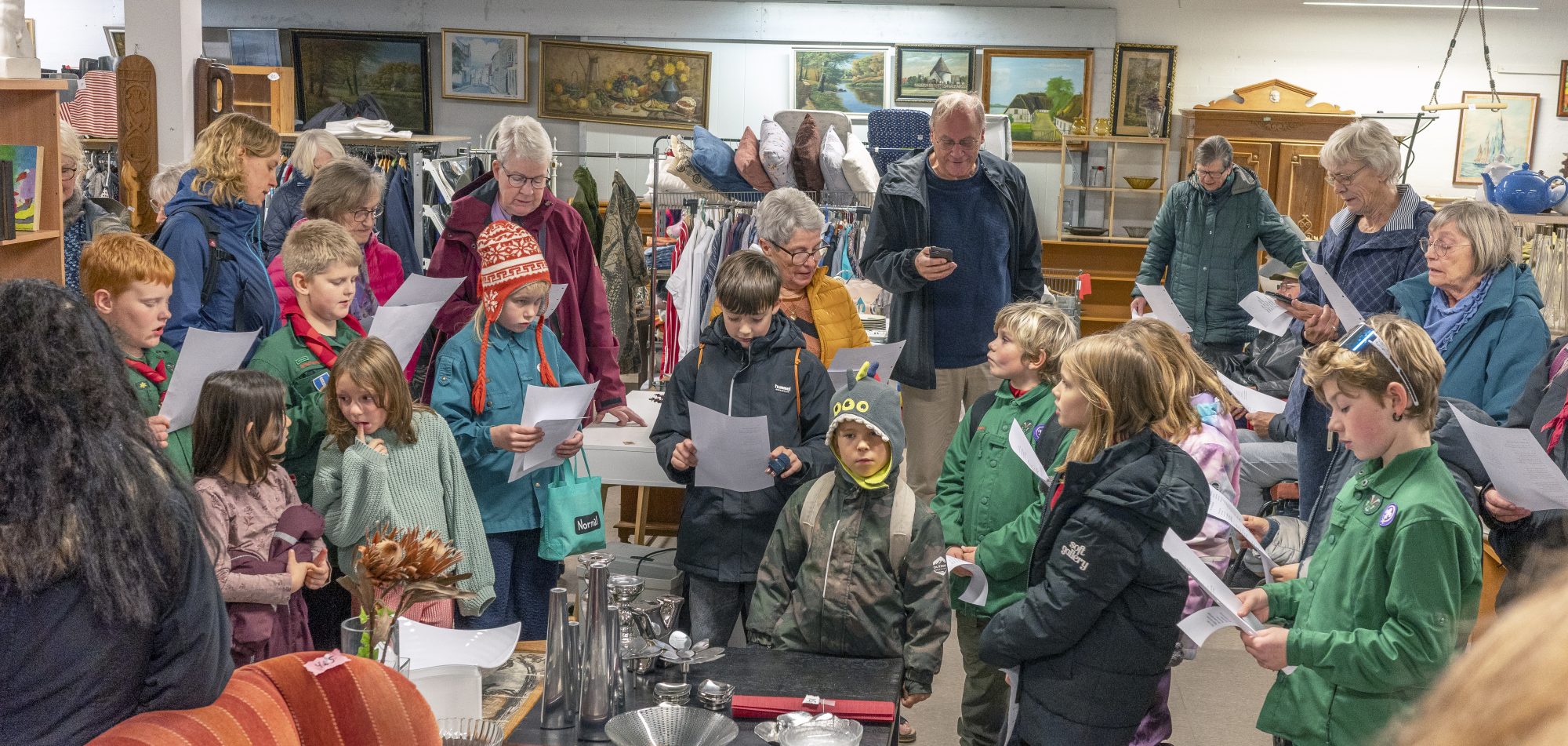 Ud over 35-40 lidt ældre feldere mødte byens spejdere igen op, så der blev sunget godt med mellem butikkens reoler, borde, fade, glas og tallerkener, fortæller Birgitte Ekholm Gardsted, Frørup.
