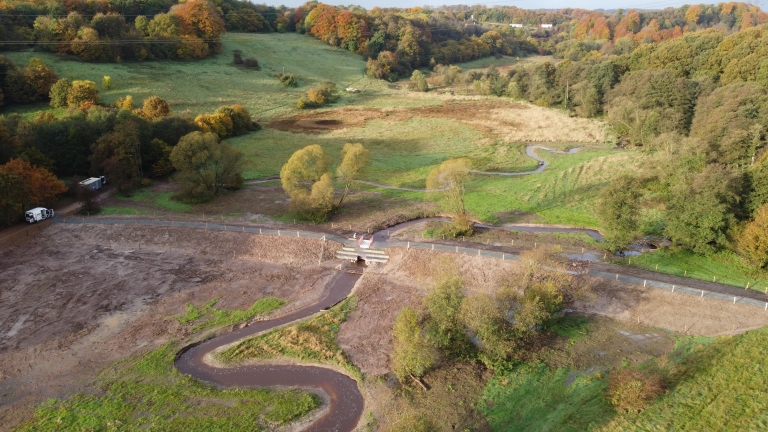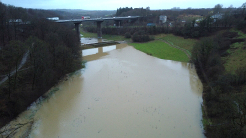 Sådan så det ud i 2022, da vandmasserne blev holdt tilbage bag det vestlige jorddige ved motorvejsbroen henover Hylkedalen vest for Kolding by.