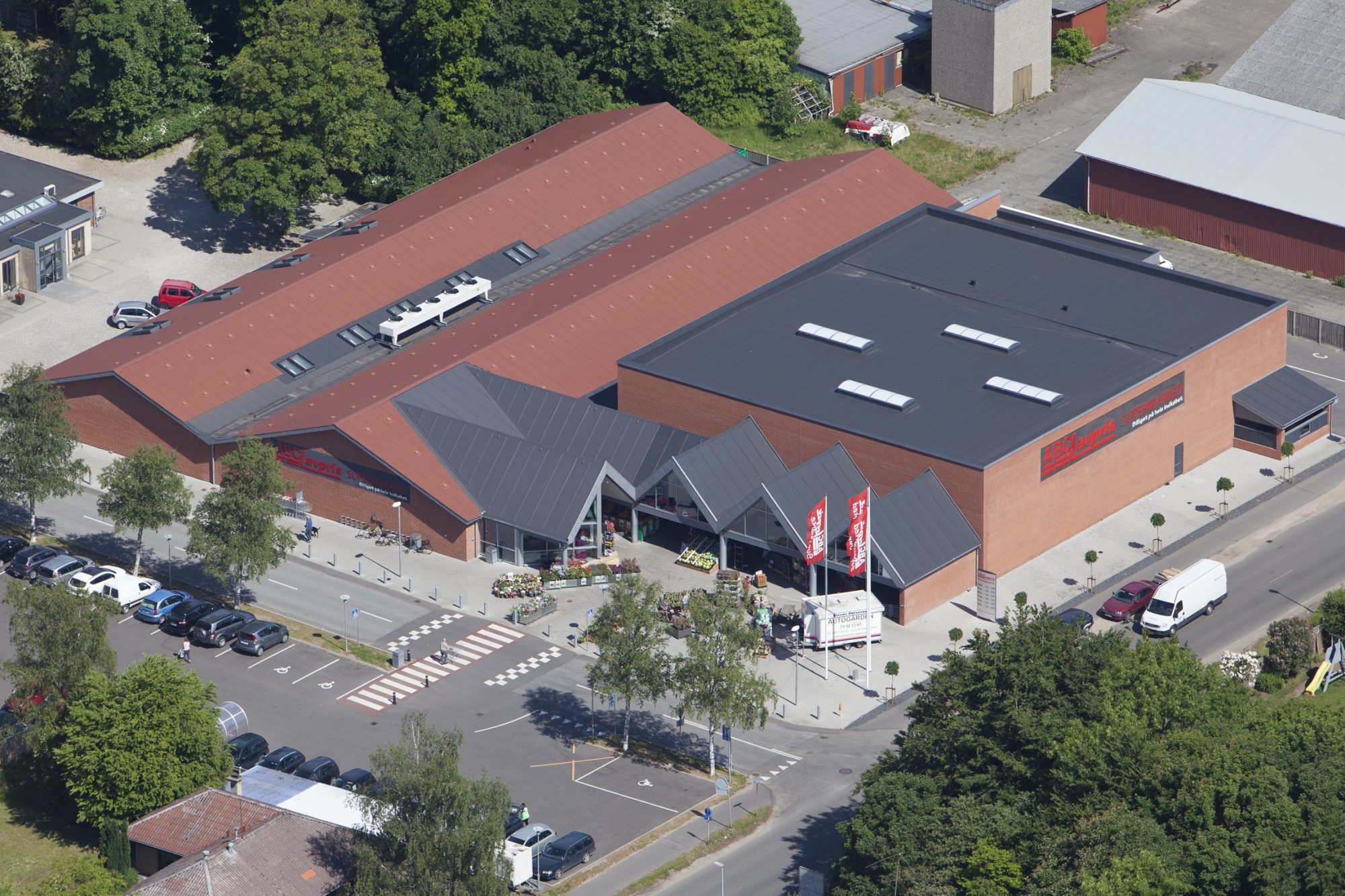 Billedtekst: ABC Lavpris i Vamdrup set i fugleperspektiv med Dixens pølsevogn, som nu lukker.