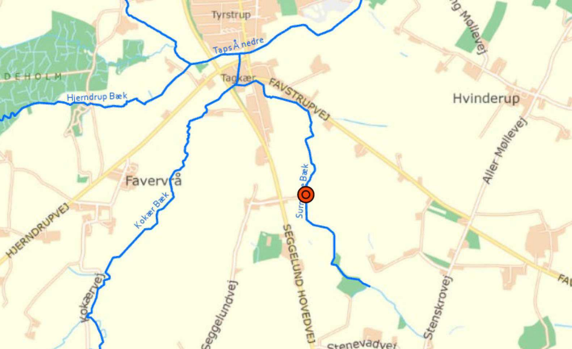 Kommunen vil fjerne en eksisterende røroverkørsel over Surmose bæk på matrikel nr. 15 Favstrup, Tyrstrup.