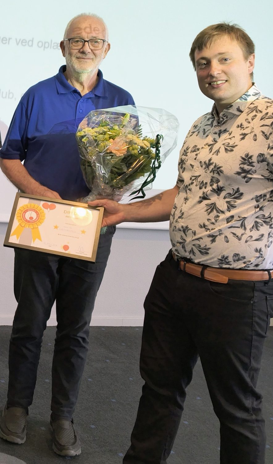 På billedet modtager Christiansfeld kegleklubs formand Emil Andersen hæder og blomster fra en repræsentant for Dansk Kegle Forbund.